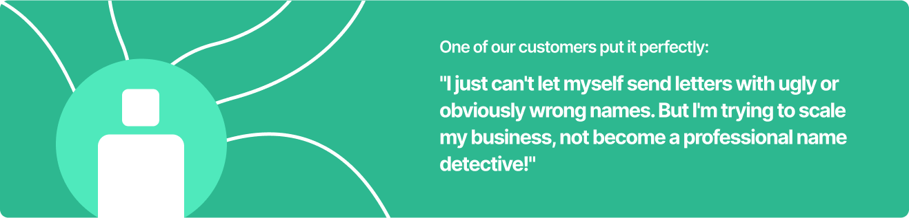 One of our customers put it perfectly: "I just can't let myself send mailers with ugly or obviously wrong names. But I'm trying to scale my business, not become a professional name detective!"